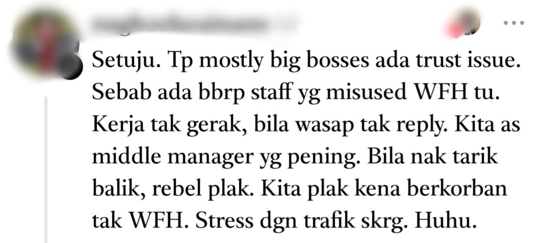 The post has since gained attention from many Malaysians who feel the same way. One user noted that one of the main reasons companies reject WFH is due to trust issues.
