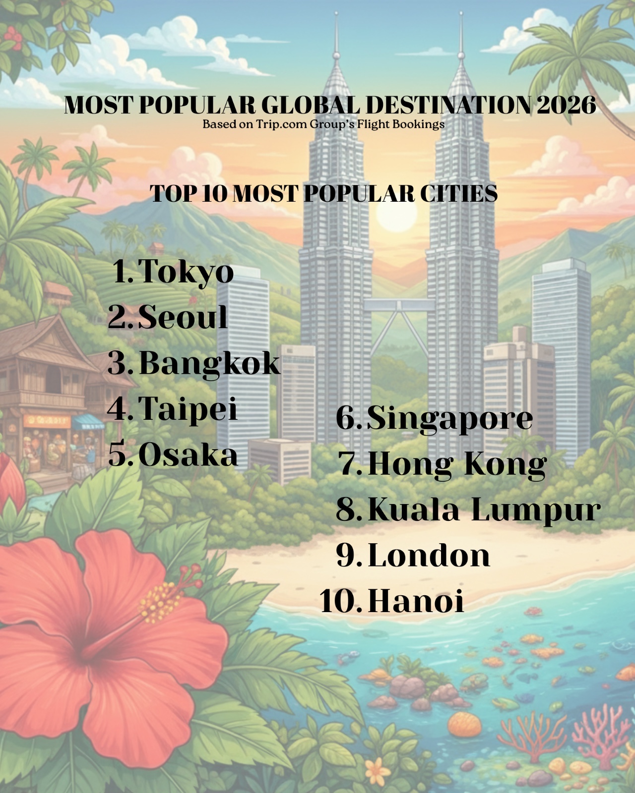 Berdasarkan data tempahan perjalanan dari 1 Januari hingga 31 Mac 2026, Pengurus Besar Trip.com Malaysia, Stephane Thong memaklumkan bahawa Malaysia berada dalam kelompok lima destinasi luar negara utama bagi pelancong dari Asia Tenggara dan China.