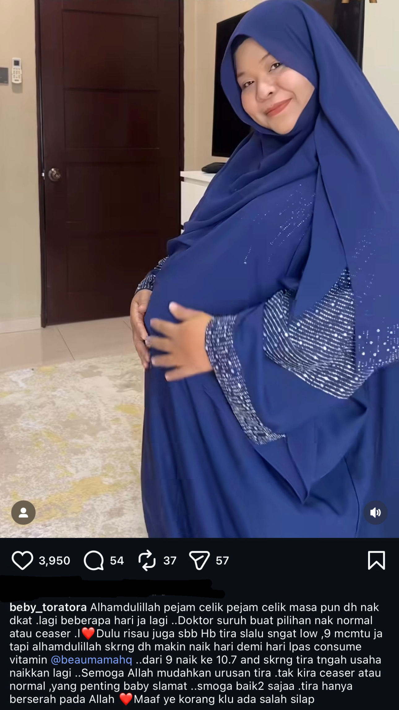 Dalam satu hantaran lain, Bebytora juga memaklumkan bahawa dia diberi pilihan sama ada mahu bersalin secara normal atau pembedahan.