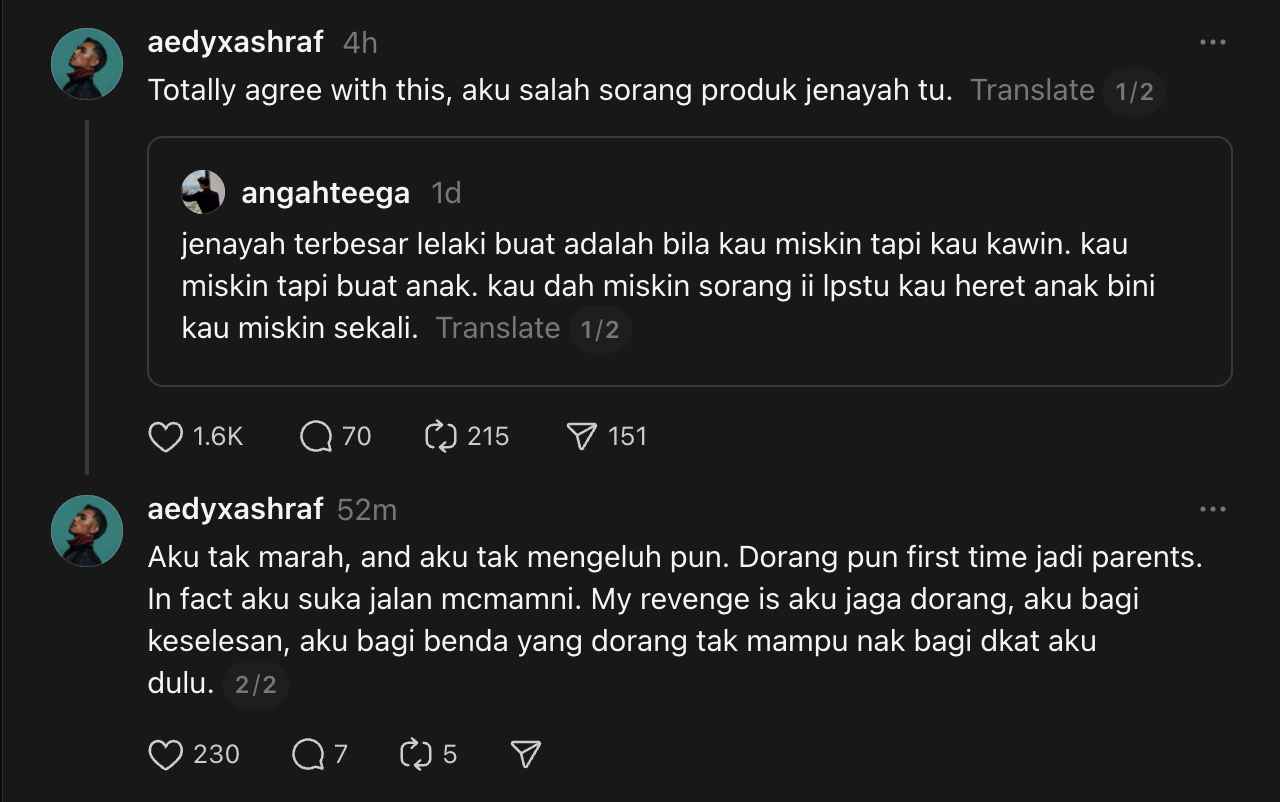 “Jenayah terbesar lelaki buat adalah bila kau miskin tapi kau kawin. kau miskin tapi buat anak. kau dah miskin sorang ii lpstu kau heret anak bini kau miskin sekali,” kata individu tersebut.