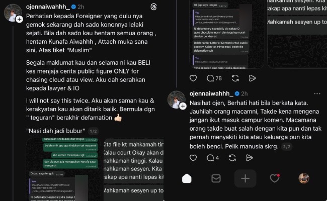 Menerusi Threads, Ojen atau nama sebenarnya Mohd Ruzain Ahza Mohd Rosli memuat naik tangkap layar perbualan WhatsApp bersama seorang peguam berhubung beberapa video dimuat naik jurulatih kecergasan tersebut yang didakwa telah merosakkan nama baik bisnesnya.