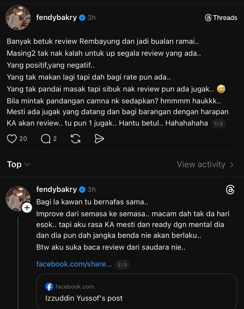 Menerusi perkongsian di platform Threads miliknya, Fendy berkata fenomena tular tersebut menyaksikan terlalu banyak ulasan dibuat, tidak kira sama ada positif mahupun negatif, sehingga ada yang dilihat agak keterlaluan.