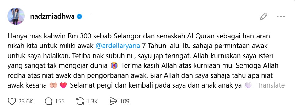 “Hanya mas kahwin Rm 300 sebab Selangor dan senaskah Al-Quran sebagai hantaran nikah kita untuk miliki awak @ardellaryana 7 Tahun lalu. Itu sahaja permintaan awak untuk saya halalkan.