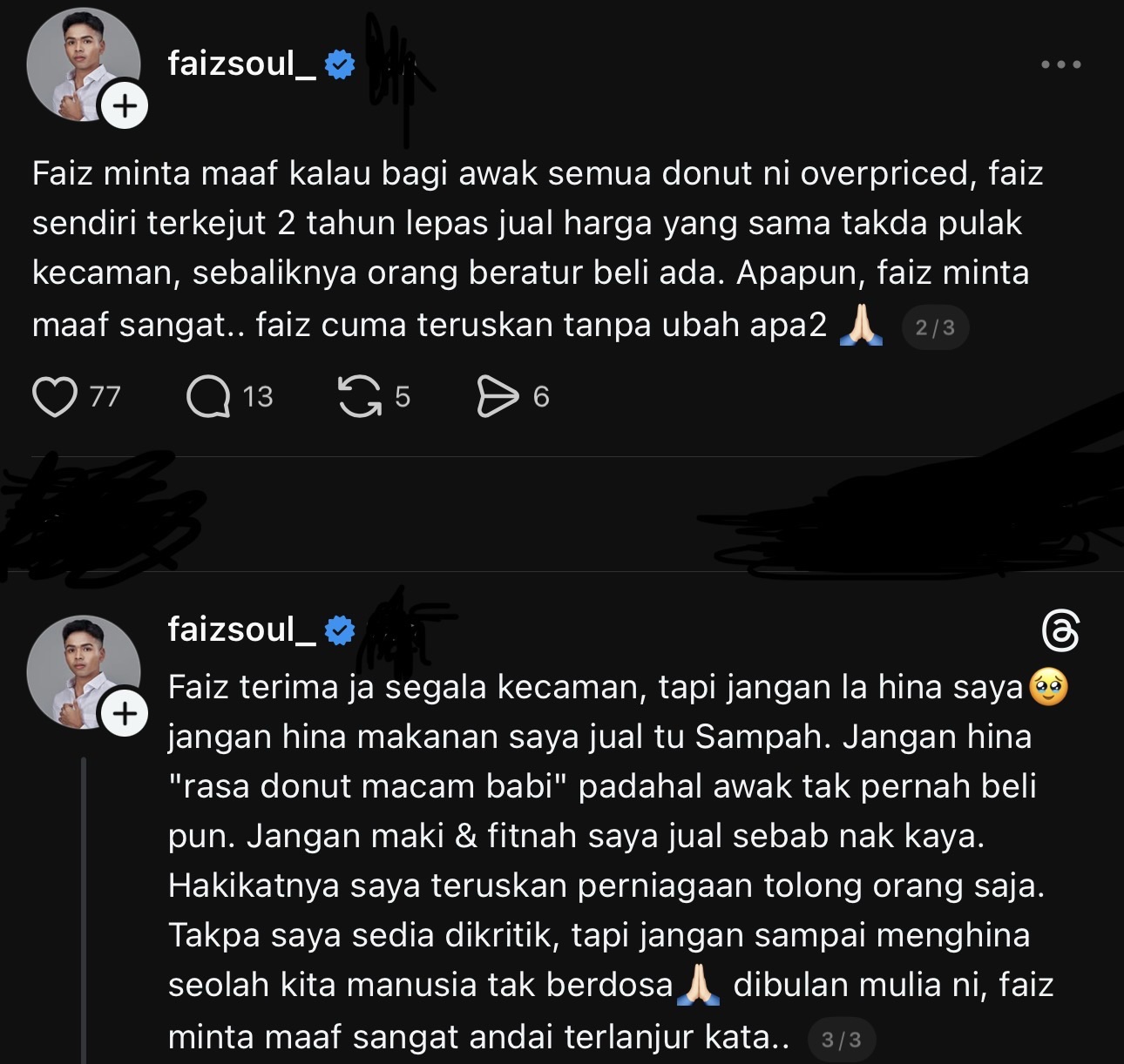 Pempengaruh, Faiz Soul tampil membuat permohonan maaf secara terbuka susulan tular satu perkongsian mengenai harga donut yang dijualnya pada harga RM10 sebiji.