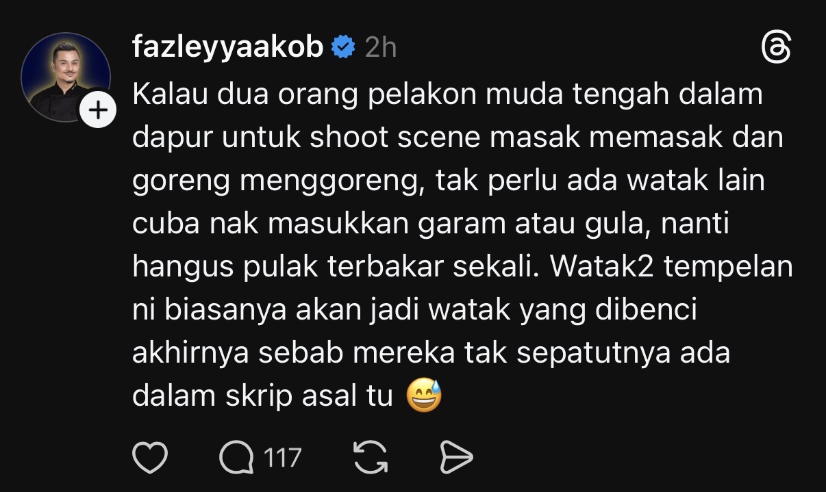 “Kalau dua orang pelakon muda tengah dalam dapur untuk shoot scene masak memasak dan goreng menggoreng, tak perlu ada watak lain cuba nak masukkan garam atau gula, nanti hangus pulak terbakar sekali.