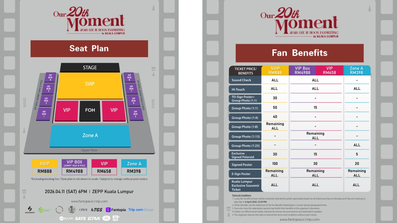 Menariknya, pakej tiket turut disertakan dengan pelbagai faedah peminat seperti sesi sound check, hi-touch, peluang bergambar 1:1, sesi foto berkumpulan, poster bertandatangan serta polaroid eksklusif bergantung kepada kategori tiket yang dipilih.