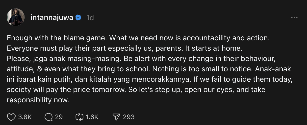 Menerusi satu hantaran di platform Threads, Intan menegaskan bahawa golongan ibu bapa perlu lebih bertanggungjawab dan peka dalam mendidik serta memantau anak-anak di era yang semakin mencabar kini.