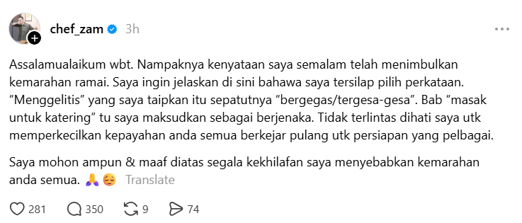 - Chef Zam memohon maaf selepas kenyataannya di Threads mencetuskan kemarahan netizen kerana salah pilih perkataan.