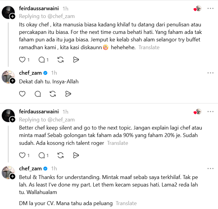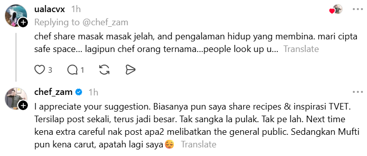 Menerusi perkongsian di Threads, Chef Zam mengakui kekhilafannya dalam memilih perkataan sehingga menimbulkan salah faham dan kemarahan netizen.