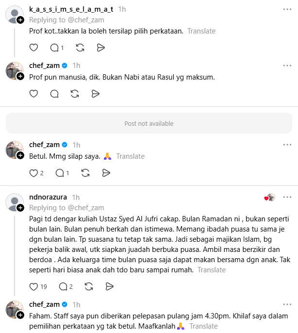 Terdahulu, Chef Zam memuat naik hantaran di Threads dengan ayat berbunyi; "Waktu berbuka 7.29pm. Yang ko menggeletis nak balik dari tempat kerja 4.30pm tu apasal pulak? Nak memasak utk catering business ke?."