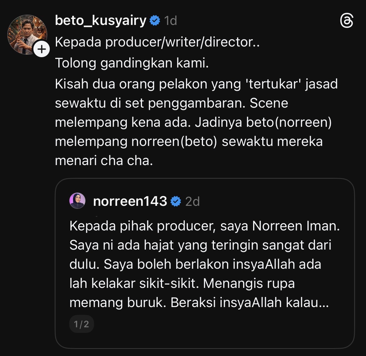 Menerusi Threads, Beto meminta mana-mana pihak produksi untuk menggandingkannya dengan Norreen.