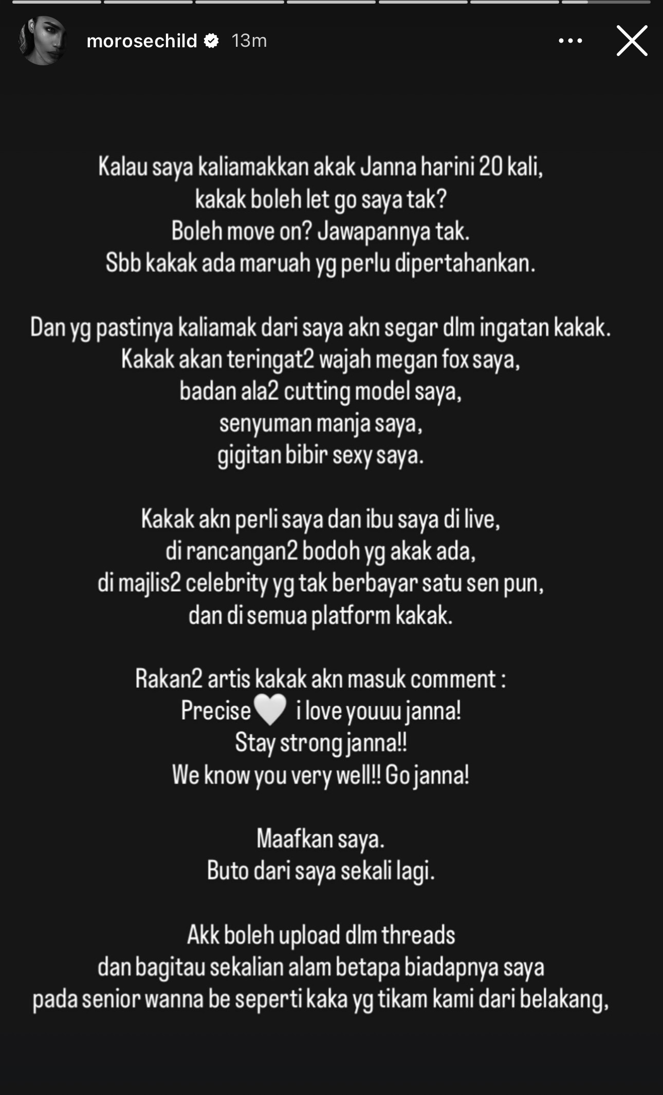“Rakan-rakan artis kakak akan masuk comment, Precise, i love youuu janna! Stay strong janna!! We know you very wel!!! Go janna!