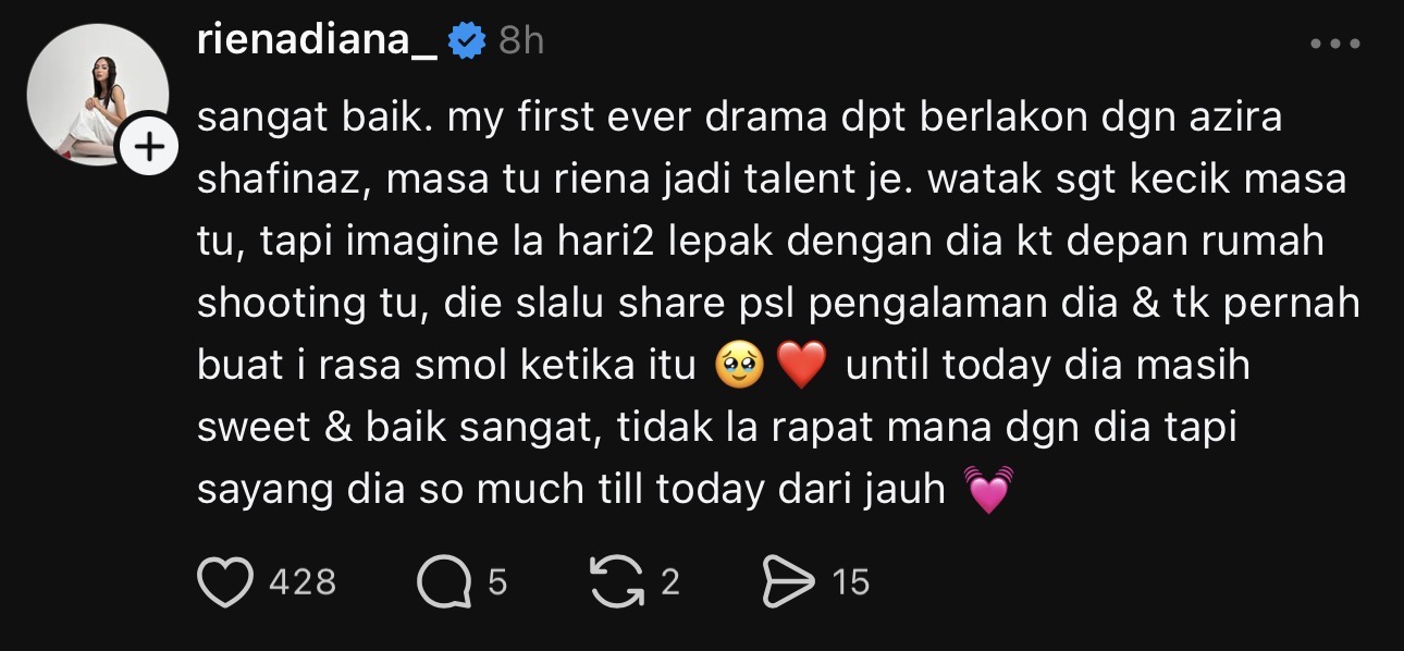 Menerusi perkongsian di platform Threads, Riena berkongsi pengalaman manis ketika pertama kali bergandingan bersama Azira dalam sebuah drama, di mana ketika itu dia hanya memegang watak kecil sebagai bakat baharu.