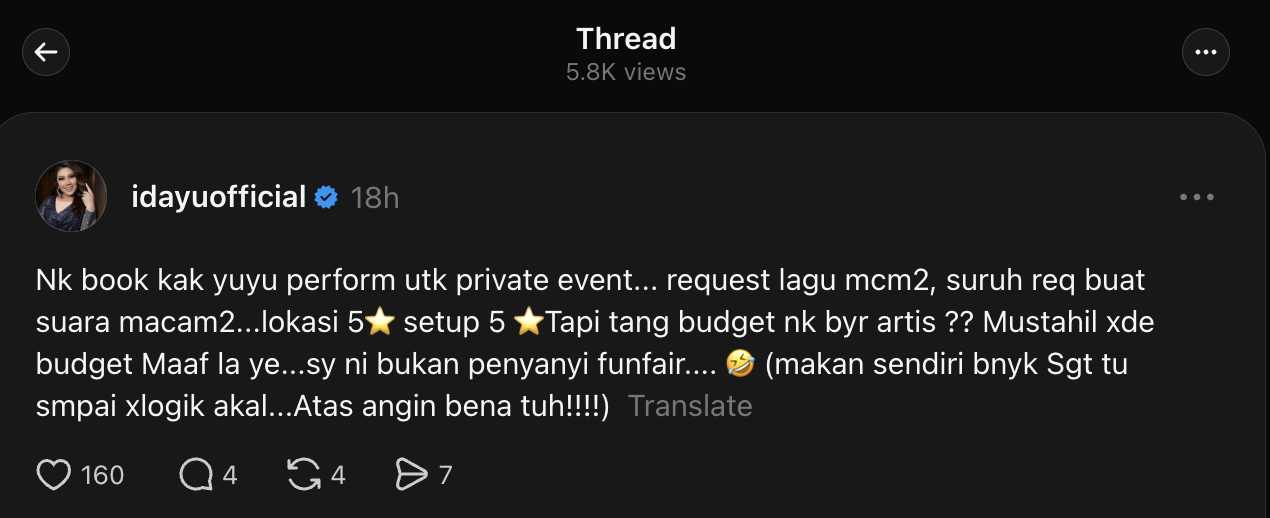 “Nak booked Kak Yuyu perform untuk private event, request lagu macam-macam, suruh request buat suara macam-macam.