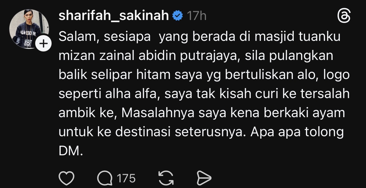 Pelakon, Sharifah Sakinah meminta mana-mana individu yang mungkin tersalah ambil untuk memulangka semula seliparnya.