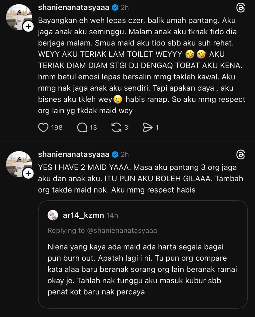 “Ya saya ada dua pembantu ya. Masa saya pantang, tiga orang jaga saya dan anak. Itu pun saya boleh gila. Tambah orang yang tak ada pembantu. Saya memang respek habis,” tulisnya menerusi hantaran di aplikasi Threads.
