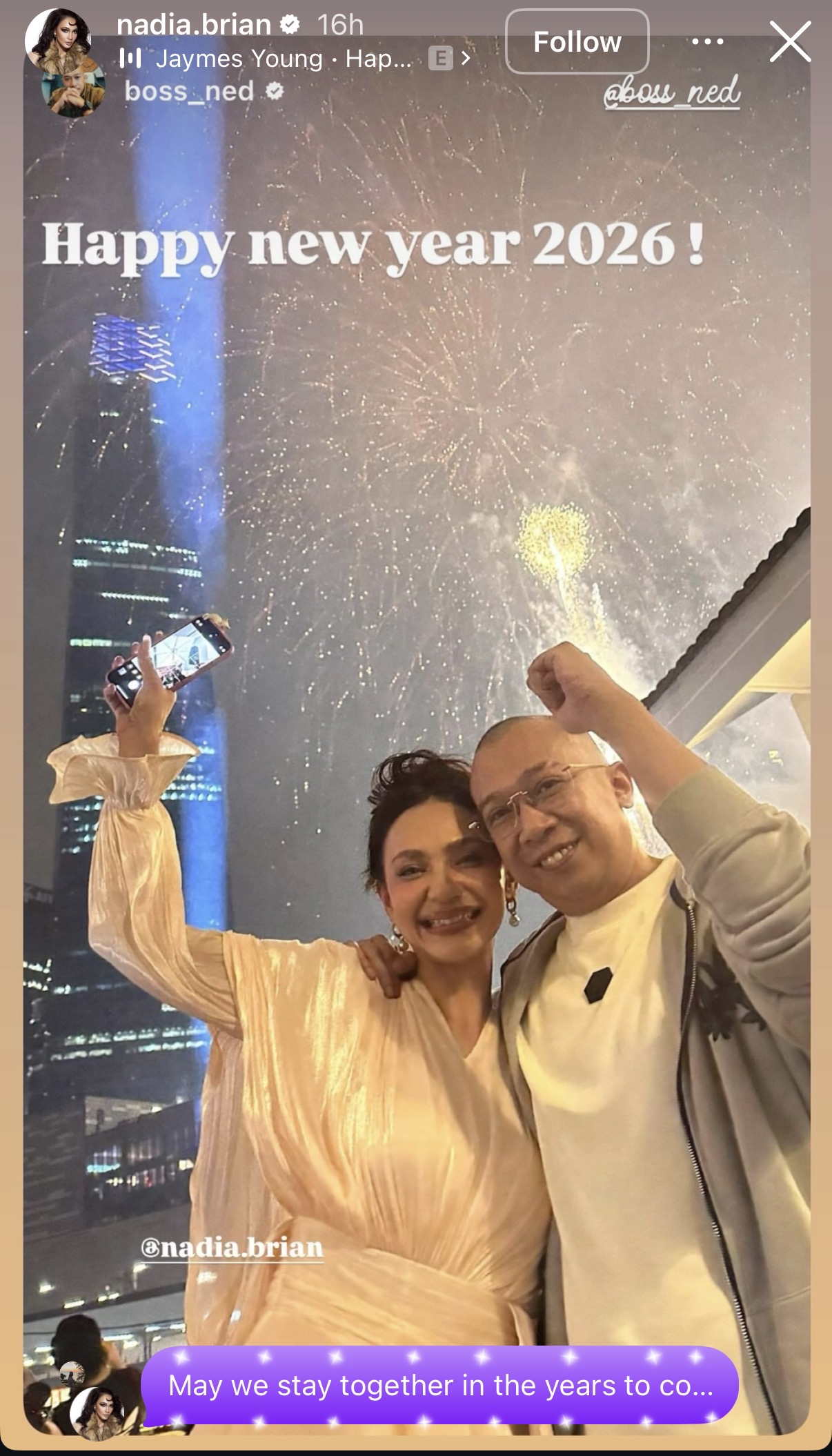 Menerusi perkongsian dibuat, Nadia meluahkan rasa syukur kerana dapat memulakan tahun 2026 bersama Nedim di sisi.