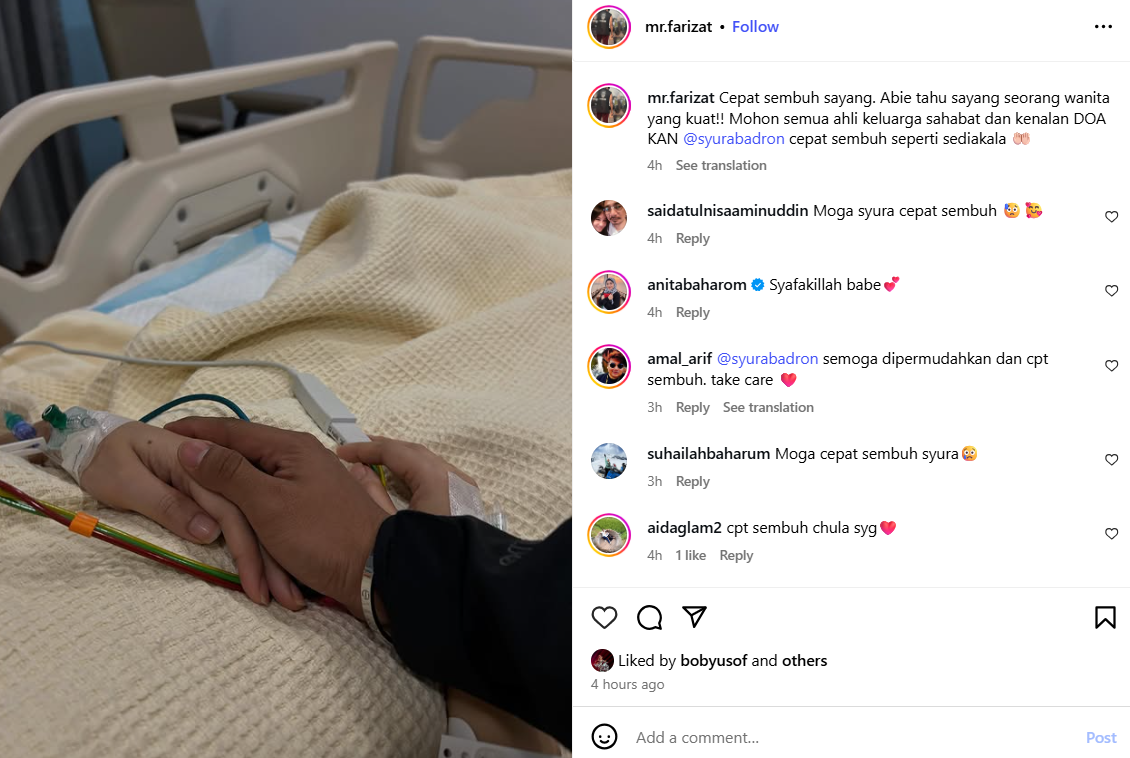 Sebelum itu, Farizat memuat naik gambar tangan Syura yang sedang dirawat di katil hospital, lengkap dengan alat pemantauan kesihatan.