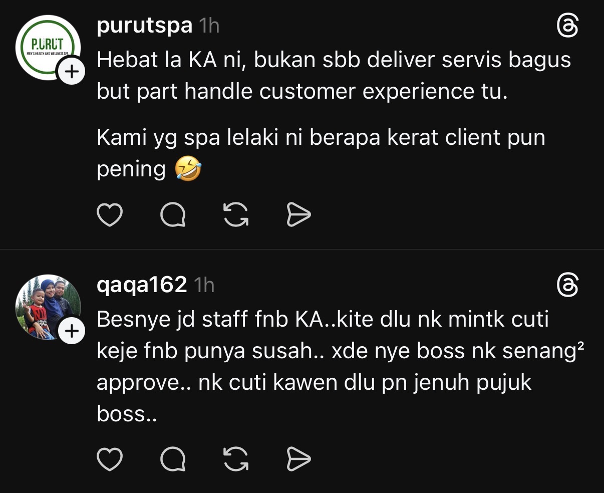 “Hebatlah KA ni, bukan sebab deliver servis bagus tapi part handle customer experience tu pun bagus.