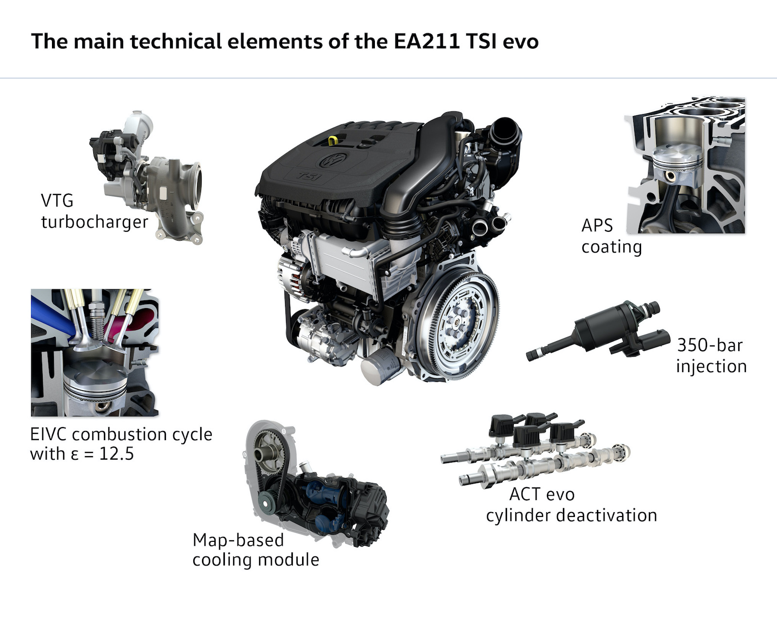 Yet, nothing is cut and dried. The TSI evo employs different technological components depending on the number of cylinders and the power output of an engine. All three-cylinder variants and the 130ps four-cylinder engine features a Miller cycle. This cycle enables a high compression rate (12.5:1 in the four-cylinder and 11.5:1 in the three-cylinder) and reduced throttling loss by closing the inlet valves early.