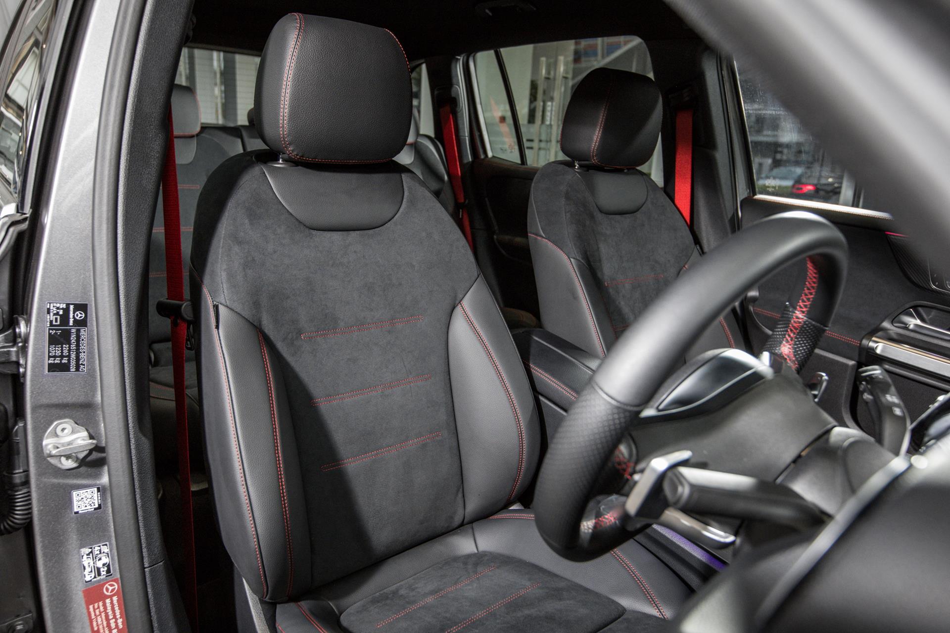 In the cabin, you’ll find a Nappa leather steering wheel, faux carbon trimmings, Artico leather/Dinamica microfibre upholstery, AMG floor mats, sports seats and designo red seat belts.