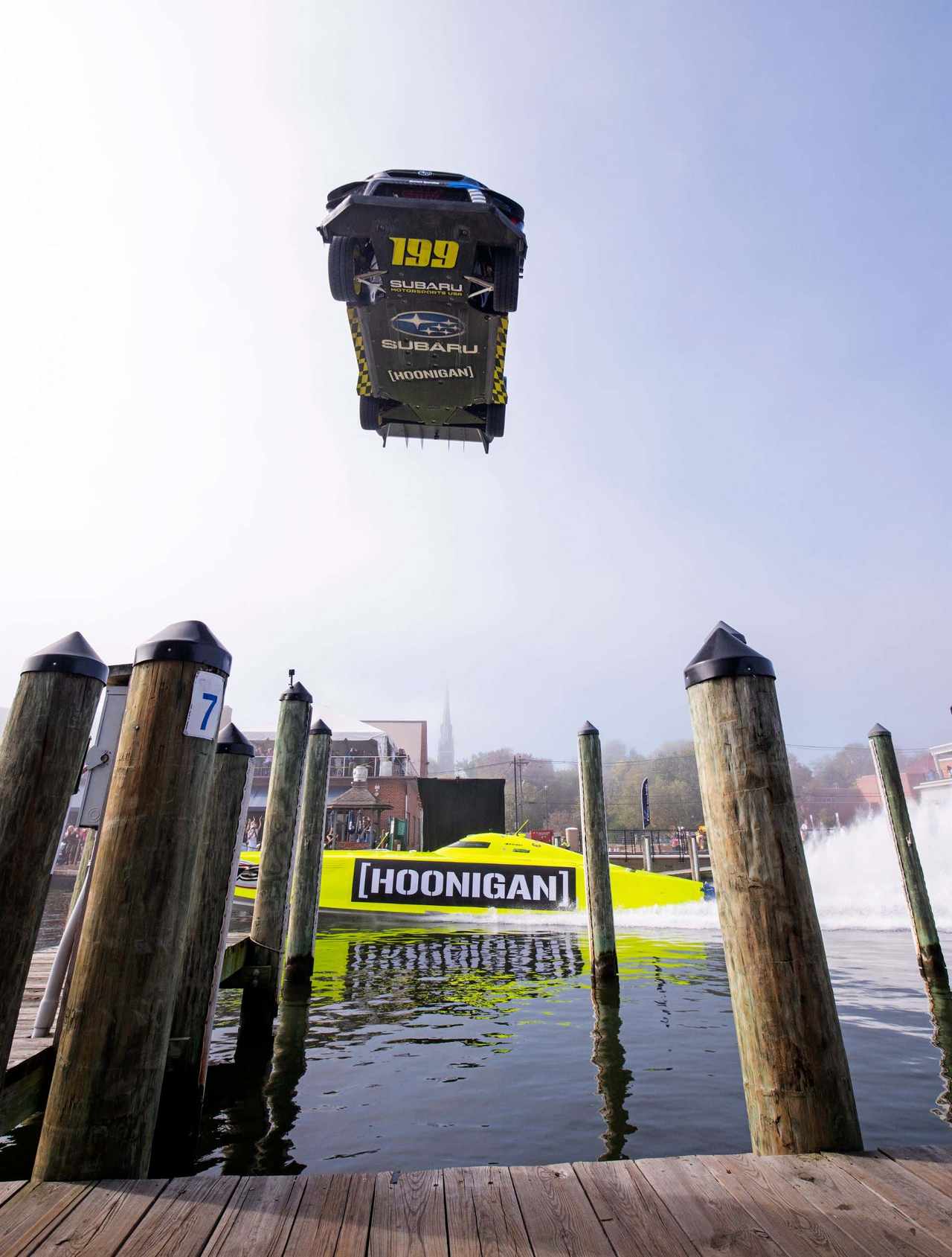 The video starts with a massive jump over a canal in Pastrana’s hometown of Annapolis, Maryland, in the United States of America. He leaps over the waterway with a racing boat skipping by underneath and we see the active wing element doing its thing and the underbody sponsor stickers. Oh yeah, the new Subaru BRZ makes a cameo as well.