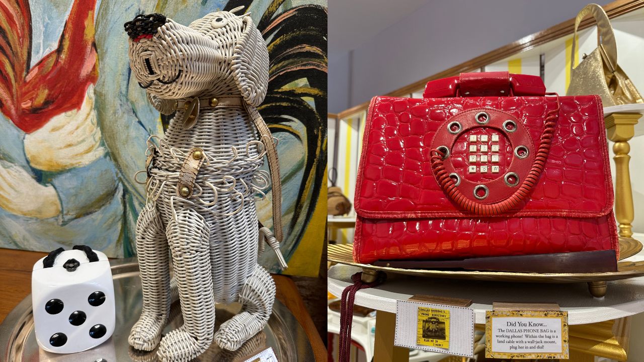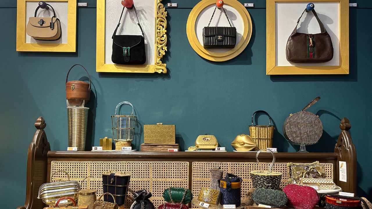 The handbags, knapsacks, clutches, totes, and more in various shapes and forms hailing from multiple decades are beyond what one expects from typical handbags. Here, you’ll find bags in the form of creatures such as a dog, a frog, and even a pickle. These are also created from materials such as acacia wood, wicker, wool felt, burlap canvas, basket reeds, satin, gold, brass, lucite, and mother of pearl. The bags are also the result of various techniques, such as brass wearing and chain-link mesh.