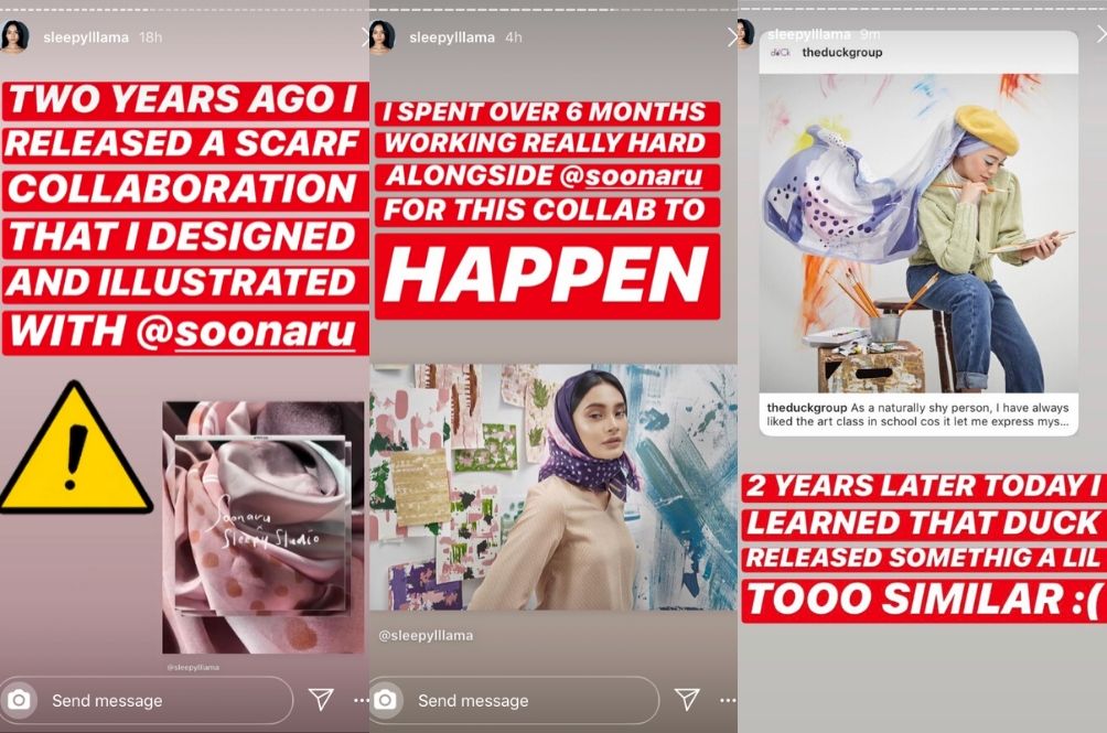 However, the collection did not sit well with many netizens as another local designer and brand – Nia Atasha (or known as Sleepy Lllama/Sleepy Studio) and Soonaru - have come forward to claim that the new dUCk Scarves collection bears a lot of resemblance to their collection which was released in 2018.