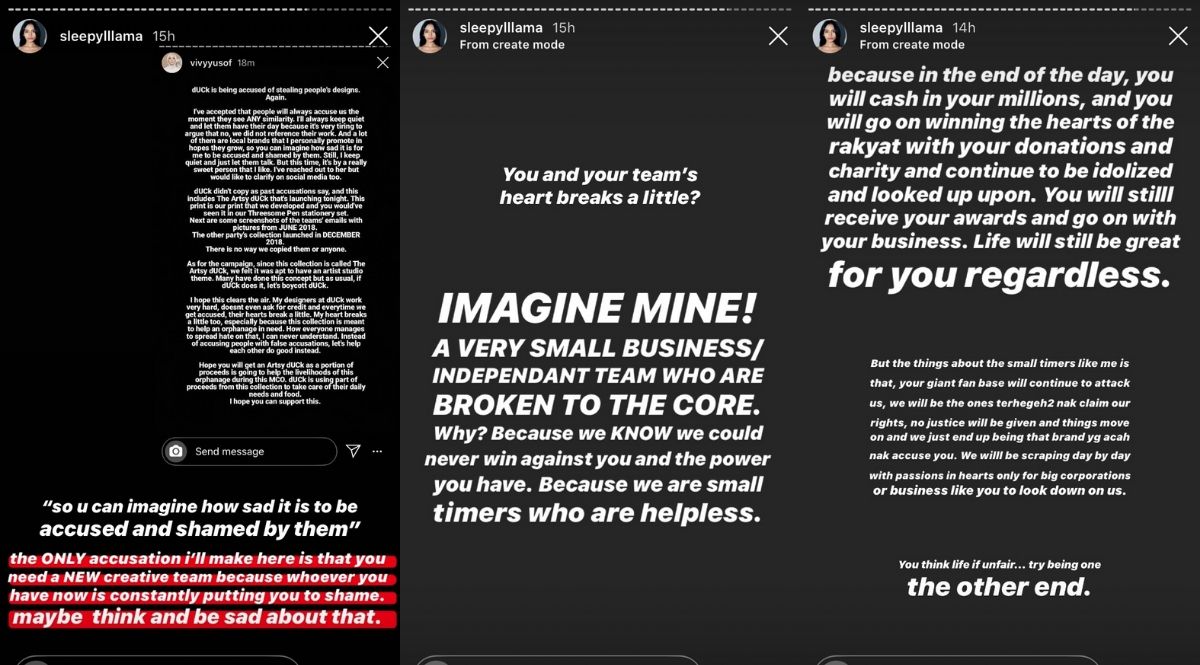 Not too long after the accusations surfaced, Vivy issued a statement via her instagram story and said that “dUCk scarves didn’t copy as past accusations say, and this includes The Artsy dUCk”.