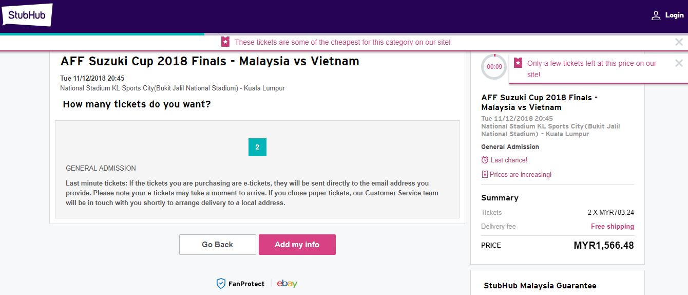According to a report by The Star Online, tickets to the final tonight (11 December) are being resold at RM783.24 apiece on ticketing site Stubhub!