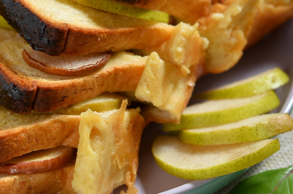 2) Susun roti bersama buah epal merah, epal hijau dan buah pir secara berselang-seli.